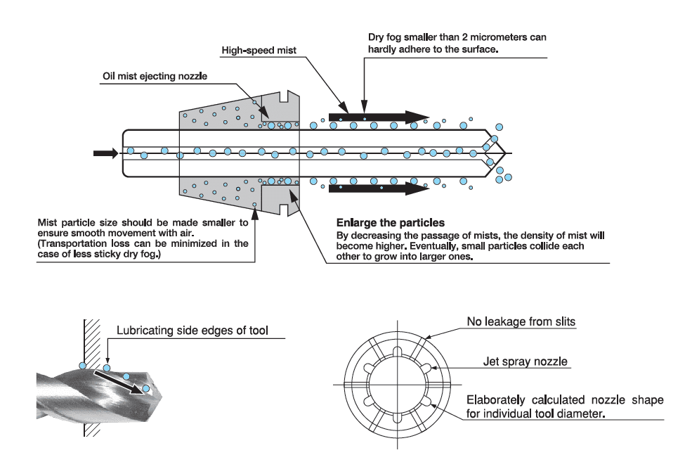 Patented oil mist spray nozzle making lubricant adhere to the surface of workpiece and tool by spraying comparatively large particles alongside the tool.