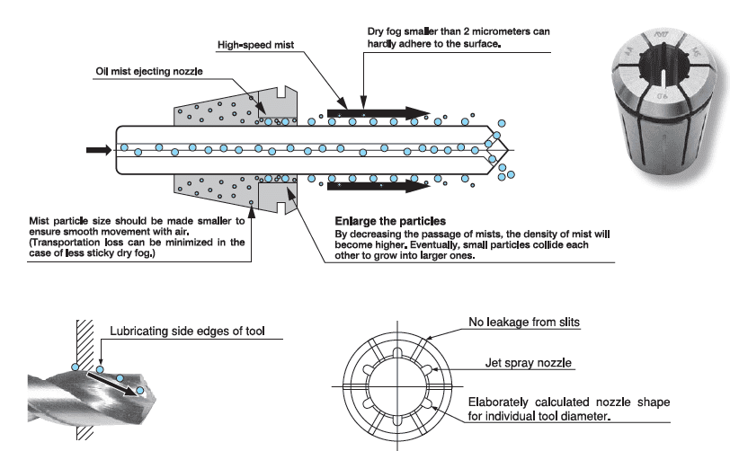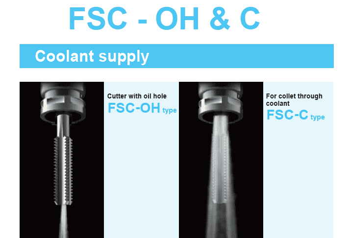 AA type for non coolant applications, OH type for steel sealed coolant through tool applications, C type for coolant through the collet when the cutting tool doesn’t have coolant holes, and MS for semidry and MQL applications