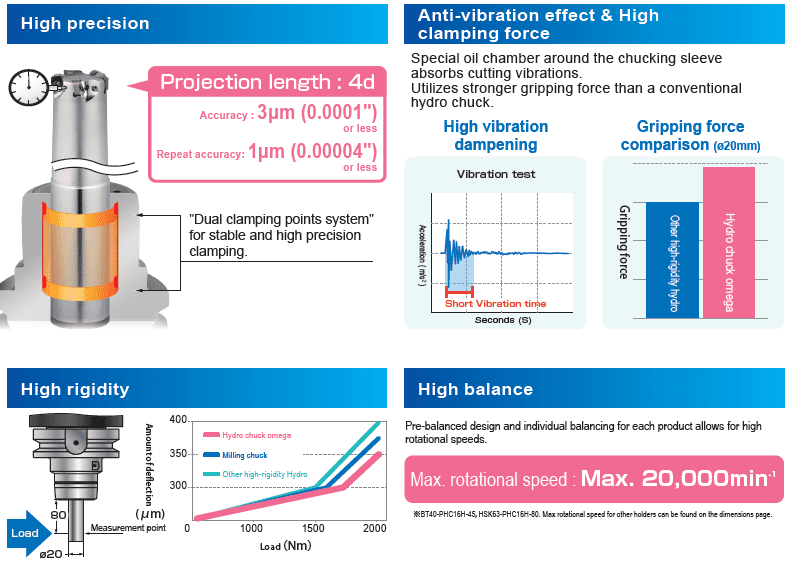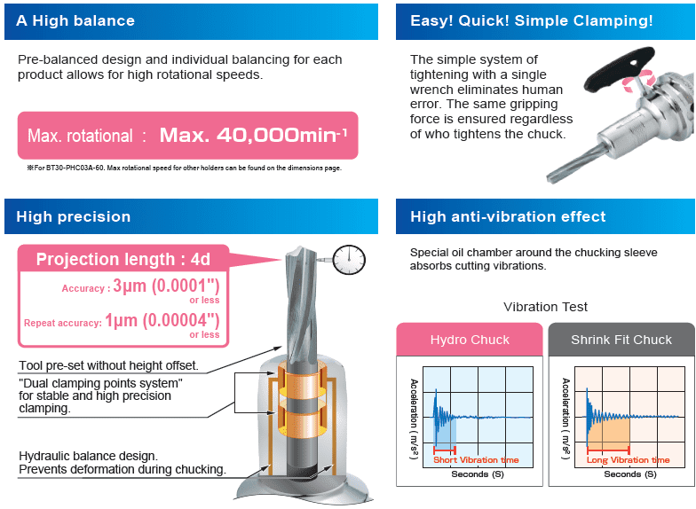 High repeat chucking accuracy, Vibration dampening, and fast tool change make the Hydro series a great choice.