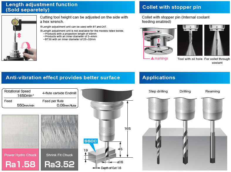 PHC-A : High precision cutting with collet holder flexibility. Drilling, Reaming, and Light Endmilling