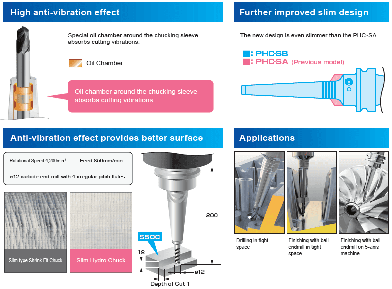 PHC-SB: Slim holder for tight spaces and high accuracy. Drilling, Reaming, and Endmill finishing