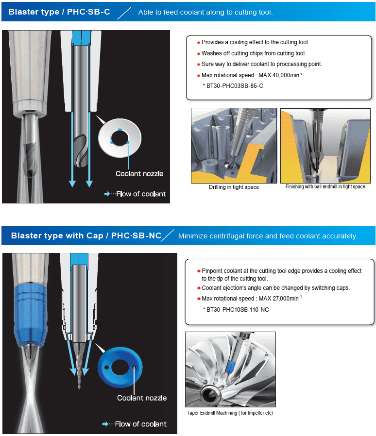 PHC-SB NC and C: Coolant blaster series, removes chips and debris as it works in tight spaces. Drilling, Reaming, and light Endmilling